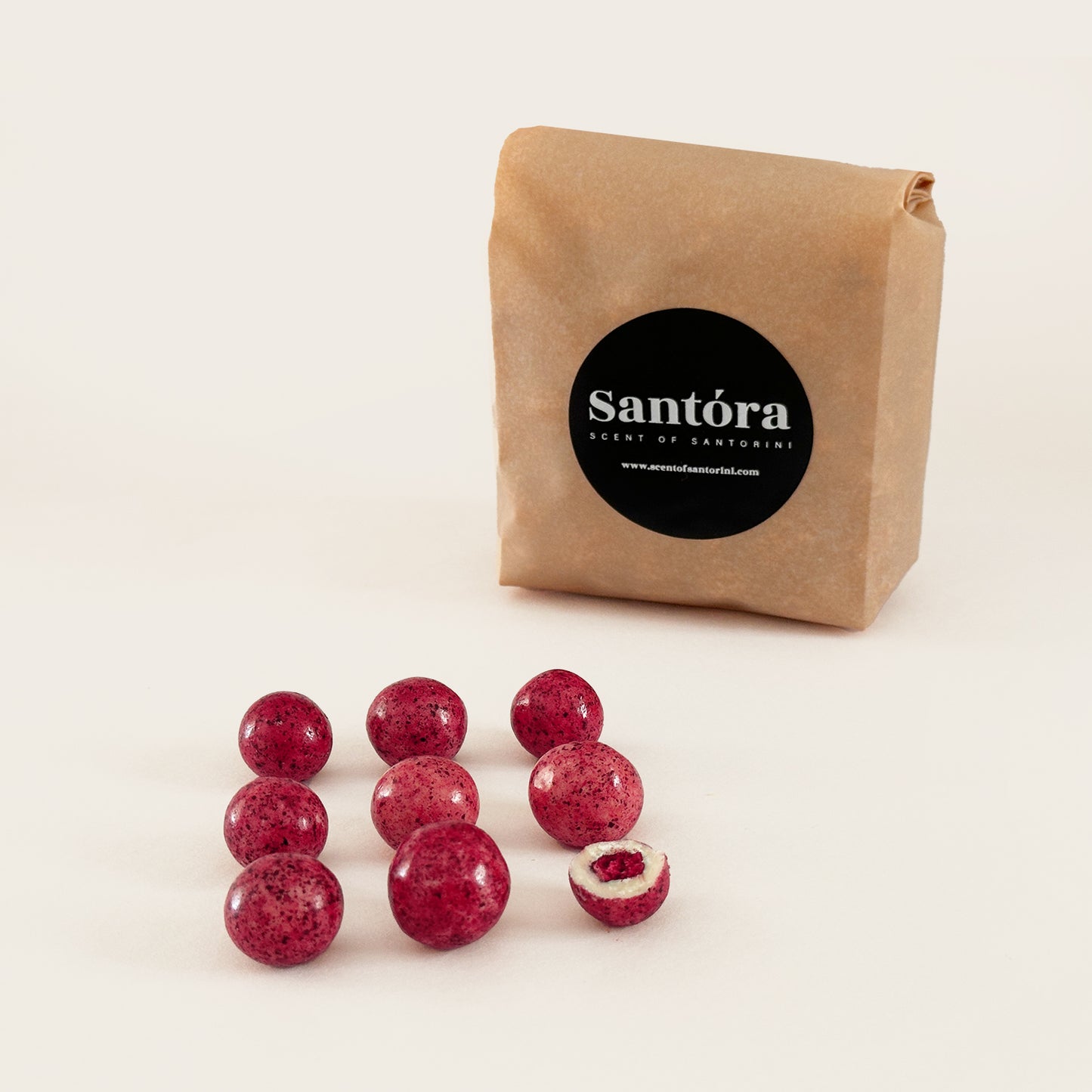 It has dried Blueberries (known in Greece as Myrtilo) and the magic touch of greek Yogurt: Two nutritious foods in one delicious snack. A great idea and alternative for those who love chocolate but have to replace a part of it with a more nutritious option. Its external color is the result of mixing yogurt with the natural blueberry juice.